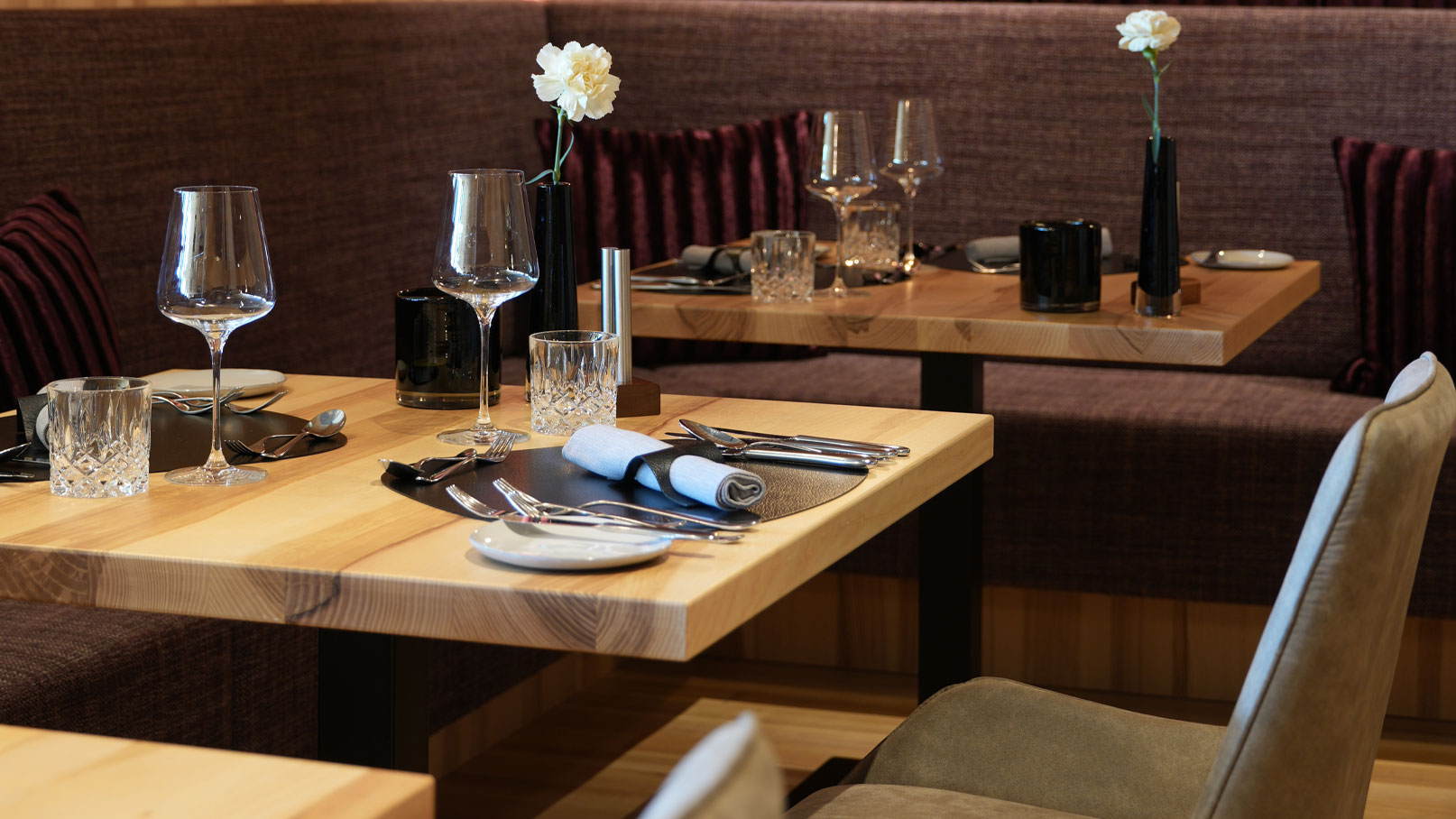 Der Alpenstern stillt den Hunger auf Genuss in drei Restaurants: dem großen Hausrestaurant „1580“ mit Fünf-Gänge-Wahlmenüs, dem À-la-carte-Panoramarestaurant „Genusshalde“ und dem heimeligen Gourmetlokal „Löffelspitze“ für Feinschmecker:innen. Gekocht wird mit regionalen Zutaten aus biologischem Anbau: Fleisch aus Au, Eier aus Damüls und vieles von heimischen Bauern und Produzent:innen. Die Weine stammen aus dem hauseigenen Keller, noch mehr feine Tropfen schenkt die stilvolle Hotelbar „Novum“ aus.