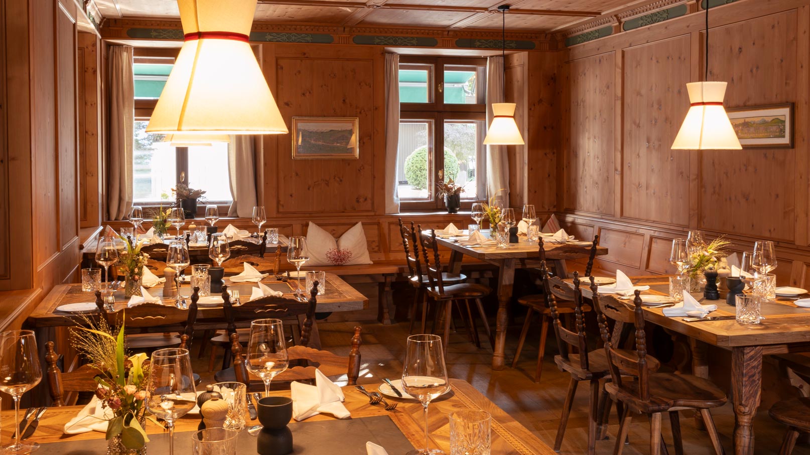 Ob im eleganten Restaurant, in der historischen „Schurle Halle“, im gemütlichen „Jagdhaus“ oder im stimmungsvollen „Taubenkeller“ – das Haus bietet für jede Gelegenheit die passende Bühne. Die Küche bleibt dabei fest in der Region verankert: Produkte aus dem Montafon und der Umgebung stehen das ganze Jahr über im Mittelpunkt, zur Saison ergänzen Wildgerichte aus eigener Jagd die Speisekarte.