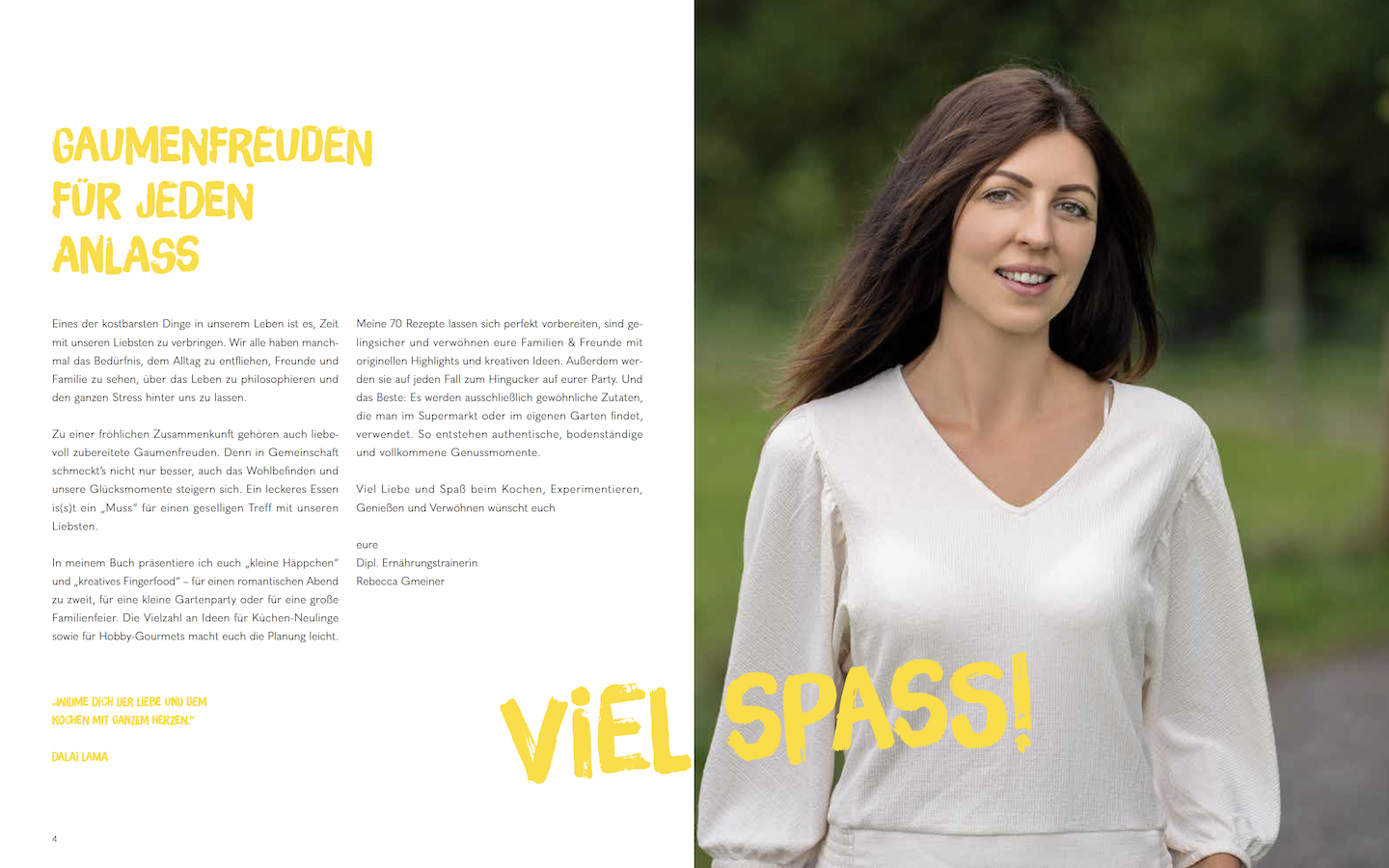 Rebecca Gmeiner, diplomierte Ernährungstrainerin und passionierte Köchin, verbindet in diesem Buch ihr Fachwissen über ausgewogene Ernährung mit ihrer Liebe zum kreativen Kochen. Ihre Erfahrung als Gastgeberin fließt in jedes Rezept ein – mit dem Ziel, Menschen zusammenzubringen, gutes Essen zu teilen und aus jedem Anlass ein Fest zu machen.